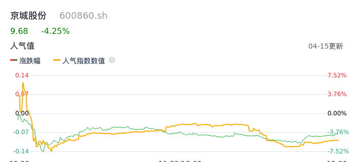 04月15日,京城股份收报9.68,股价涨幅-4.25%,成交金额1.19亿元,换手率2.88%。