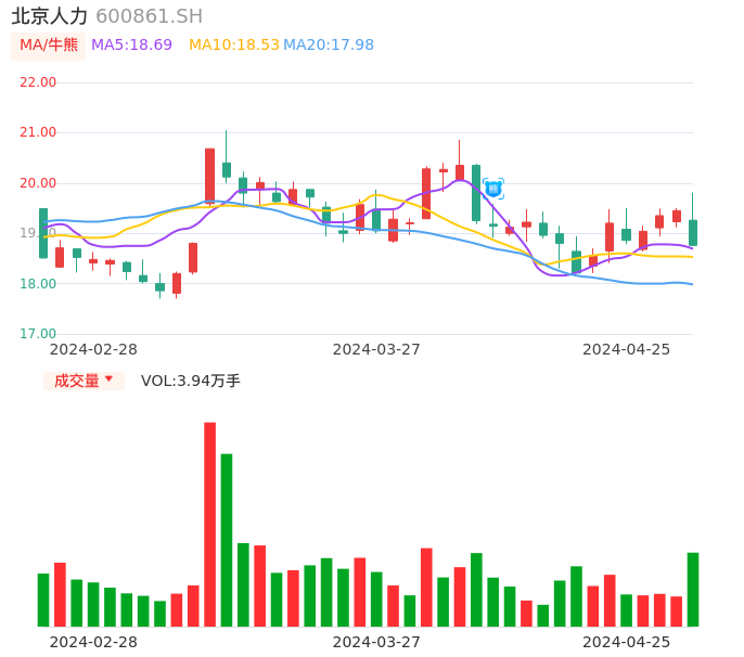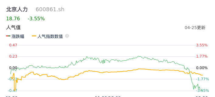 04月25日,北京人力收报18.76,股价涨幅-3.55%,成交金额7621.38万元,换手率1.24%。