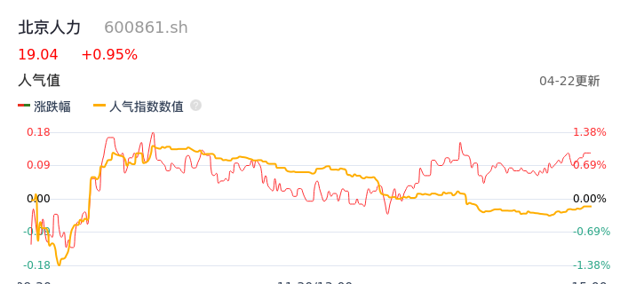 04月22日,北京人力收报19.04,股价涨幅0.95%,成交金额3151.78万元,换手率0.53%。