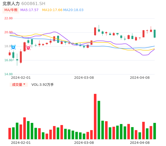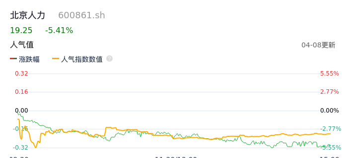 04月08日,北京人力收报19.25,股价涨幅-5.41%,成交金额7672.82万元,换手率1.24%。