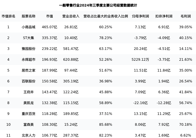 北京人力最新报告期数据为三季度,下表汇总了一般零售行业内市值靠前的公司三季度主要经营数据