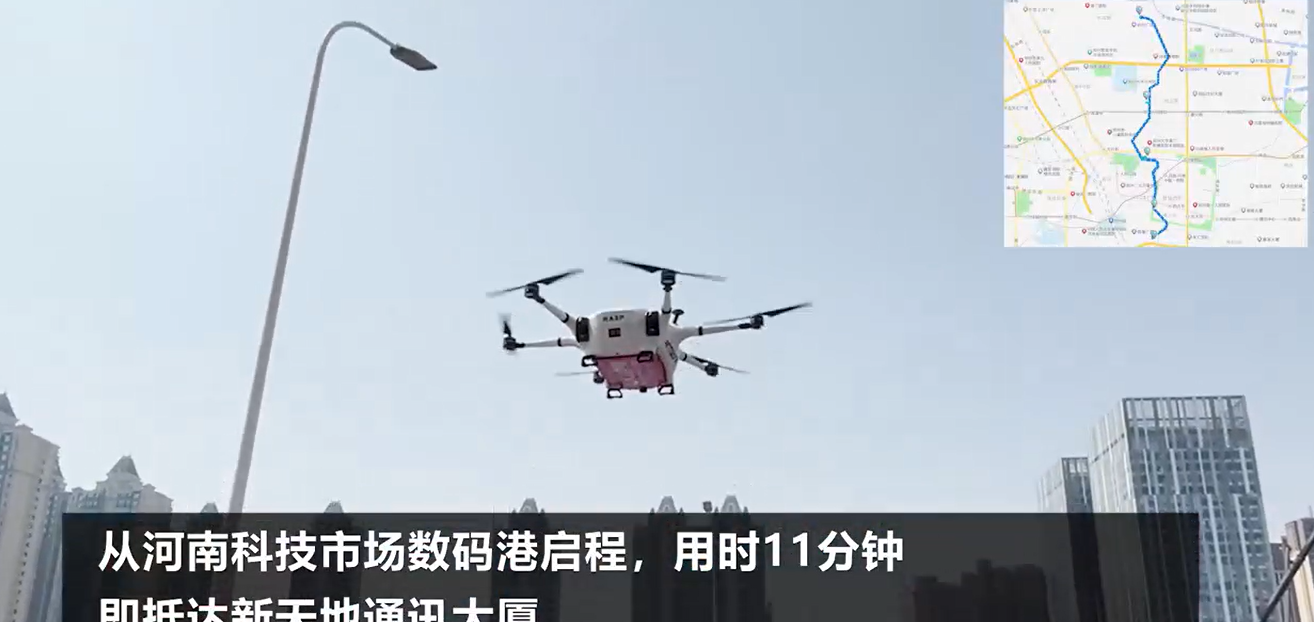 据《大河财立方》报道,当日上午10时13分,一架无人机载着用户下单购买的手机,从河南科技市场数码港启程,用时11分钟抵达新天地通讯大厦,被安全送到8.7公里外的用户手中。