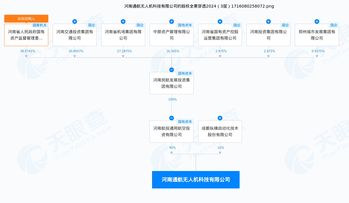 河南航投通航为中豫航空集团有限公司旗下的低空经济平台企业,天眼查显示,河南航投通航为河南通航无人机科技有限公司的控股人(持股90%),纵横股份为其股东(持股10%)。