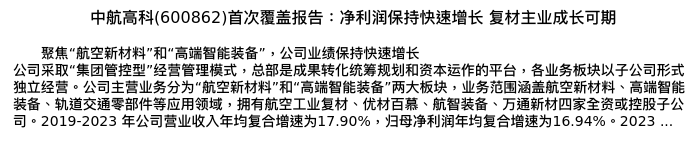 值得注意的是:2024年04月国元证券的马捷分析师,首次发布关于中航高科的研究报告,标题为:中航高科(600862)首次覆盖报告:净利润保持快速增长 复材主业成长可期。
