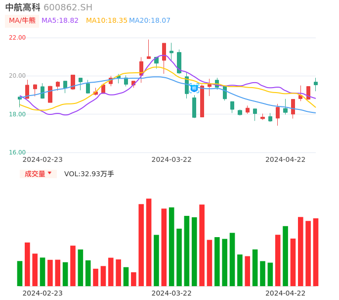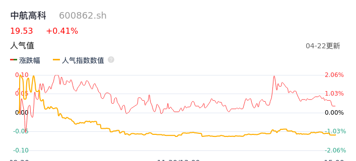 04月22日,中航高科收报19.53,股价涨幅0.41%,成交金额6.46亿元,换手率2.36%。