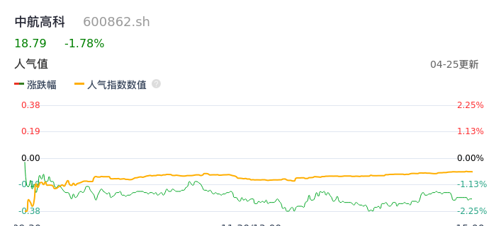 04月25日,中航高科收报18.79,股价涨幅-1.78%,成交金额3.24亿元,换手率1.24%。