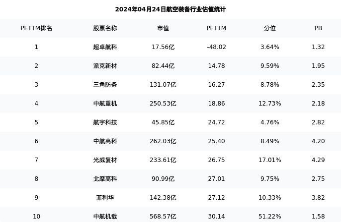 从估值角度看:中航高科最新市盈率PETTM为25.40,在行业内排名5/44,处于8.49分位。