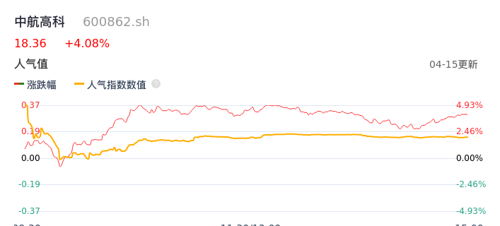 04月15日,中航高科收报18.36,股价涨幅4.08%,成交金额4.54亿元,换手率1.79%。