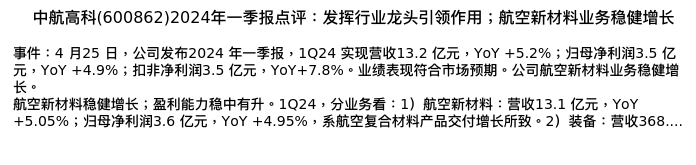 值得注意的是:2024年04月民生证券的尹会伟/孔厚融/赵博轩/冯鑫分析师,首次发布关于中航高科的研究报告,标题为:中航高科(600862)2024年一季报点评:发挥行业龙头引领作用;航空新材料业务稳健增长。