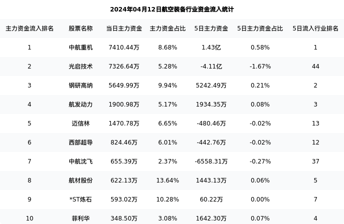 中航高科今日净流出799.01万元,主力占比3.93%,在行业内排名:35/44;5日净流出4910.83万元,主力占比0.20%,在行业内排名:34/44。