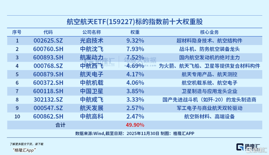 资金坚定抄底航空航天ETF(159227),或正得益于该ETF标的指数国证航天高度契合“空天一体”的战略方向,指数聚焦军工空中力量,与商业航天概念重合度高达57.94%,如中国卫星、航天电子等前十大权重股均深度参与到卫星制造、卫星测控等商业航天关键环节,光启技术的隐身材料、中航高科的复合材料等技术也可应用于卫星、运载火箭的轻量化、高性能制造环节。