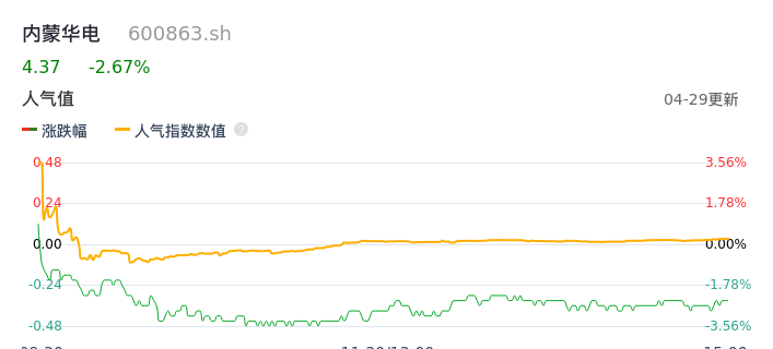 04月29日,内蒙华电收报4.37,股价涨幅-2.67%,成交金额8.01亿元,换手率2.80%。