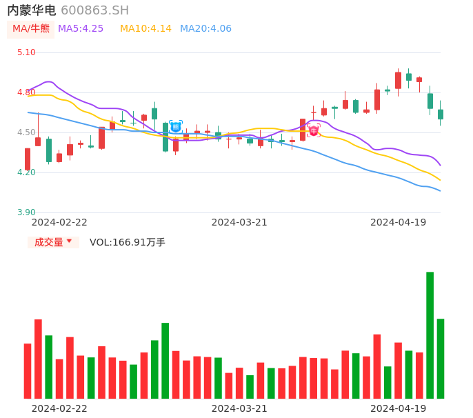 04月19日,内蒙华电收报4.60,股价涨幅-1.71%,成交金额7.73亿元,换手率2.56%。