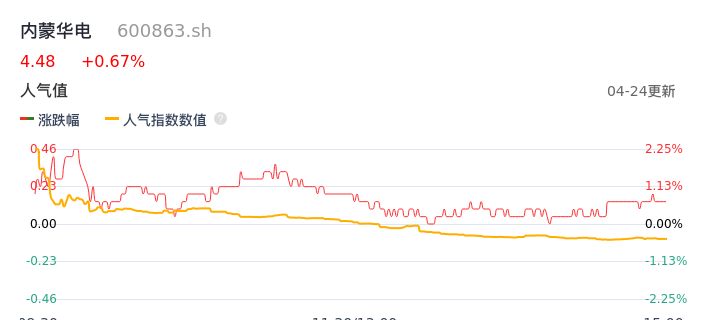04月24日,内蒙华电收报4.48,股价涨幅0.67%,成交金额4.78亿元,换手率1.63%。
