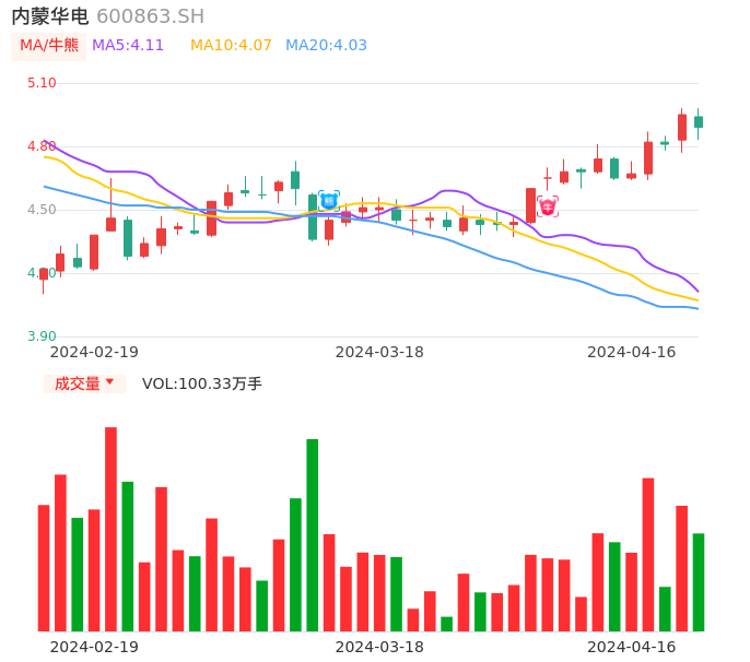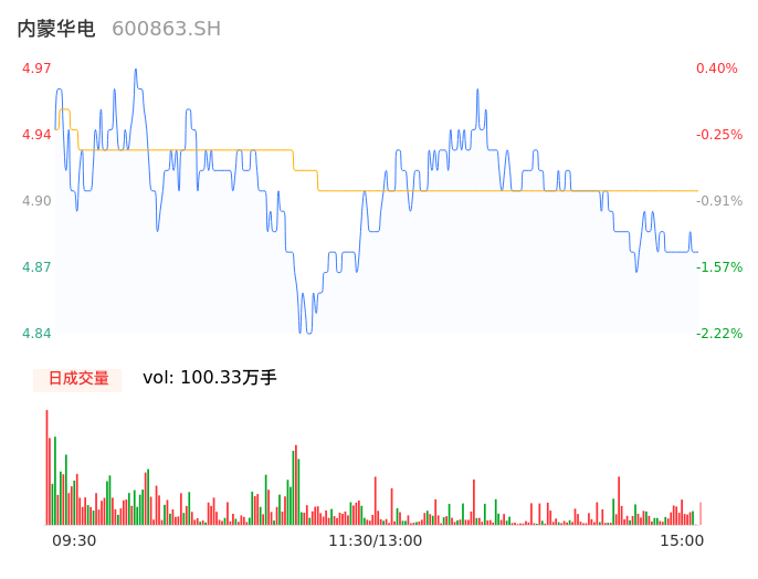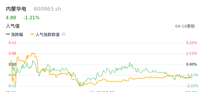 04月16日,内蒙华电收报4.89,股价涨幅-1.21%,成交金额4.93亿元,换手率1.54%。