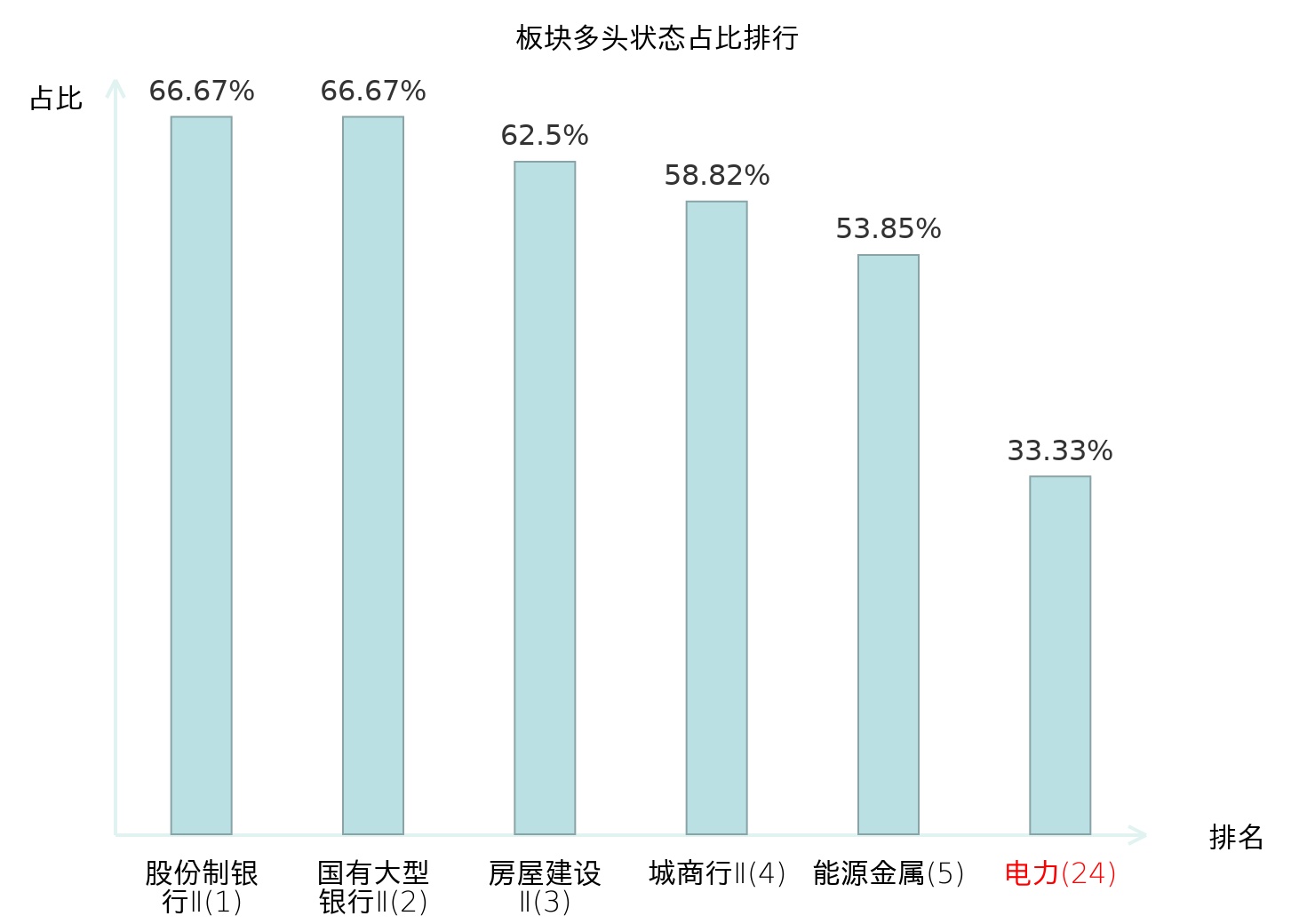 全市场所有行业板块中主力多头状态占比排名中,股份制银行Ⅱ板块位居第一。航空机场板块名次提升最快,较昨日上升68位。