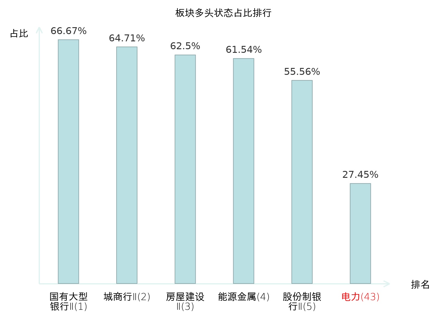 全市场所有行业板块中主力多头状态占比排名中,国有大型银行Ⅱ板块位居第一。普钢板块名次提升最快,较昨日上升65位。
