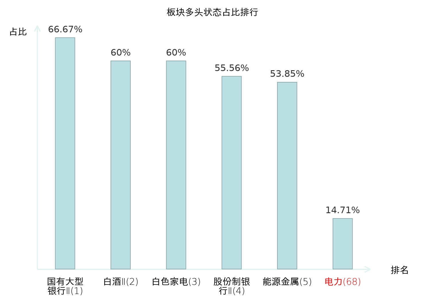 全市场所有行业板块中主力多头状态占比排名中,国有大型银行Ⅱ板块位居第一。电子化学品Ⅱ板块名次提升最快,较昨日上升55位。