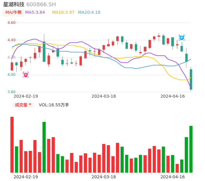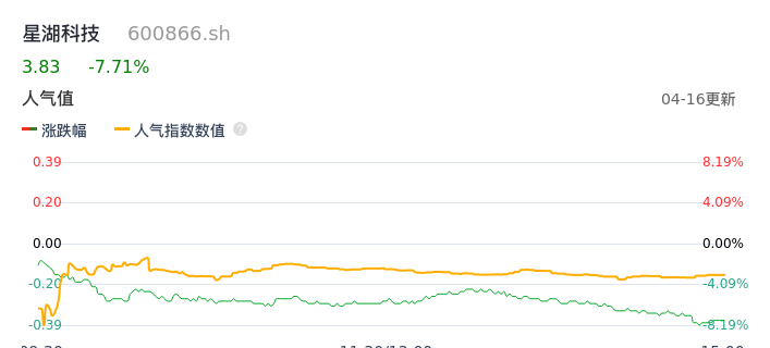 04月16日,星湖科技收报3.83,股价涨幅-7.71%,成交金额6505.32万元,换手率1.66%。