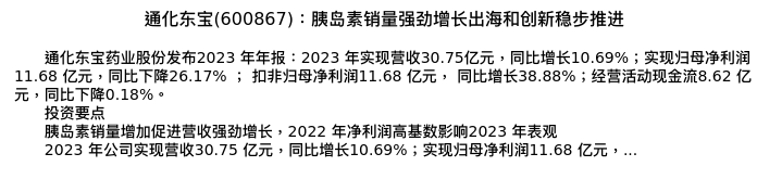 值得注意的是:2024年04月华鑫证券的胡博新/吴景欢分析师,首次发布关于通化东宝的研究报告,标题为:通化东宝(600867):胰岛素销量强劲增长出海和创新稳步推进。