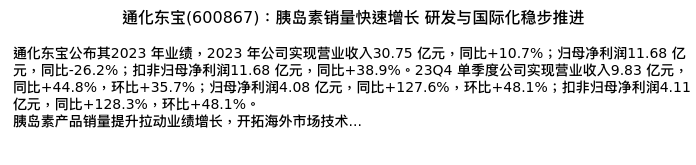 值得注意的是:2024年04月招商证券的许菲菲/梁广楷/焦玉鹏分析师,首次发布关于通化东宝的研究报告,标题为:通化东宝(600867):胰岛素销量快速增长 研发与国际化稳步推进。