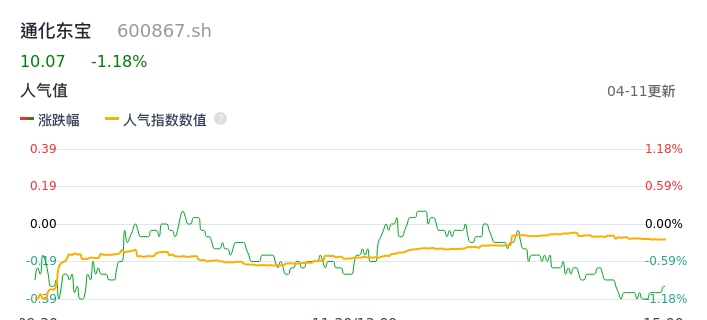 04月11日,通化东宝收报10.07,股价涨幅-1.18%,成交金额1.91亿元,换手率0.95%。