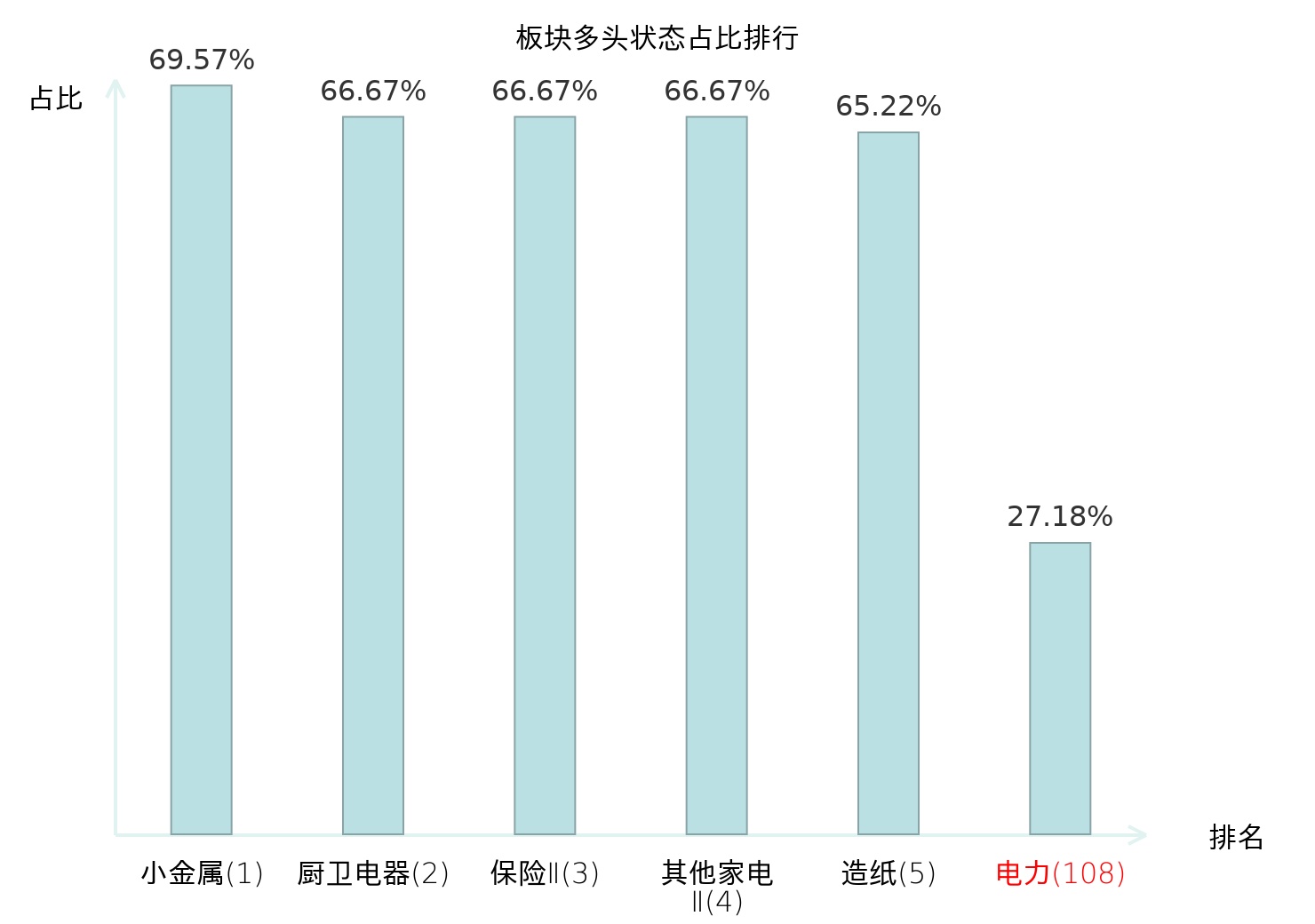 全市场所有行业板块中主力多头状态占比排名中,小金属板块位居第一。林业Ⅱ板块名次提升最快,较昨日上升86位。