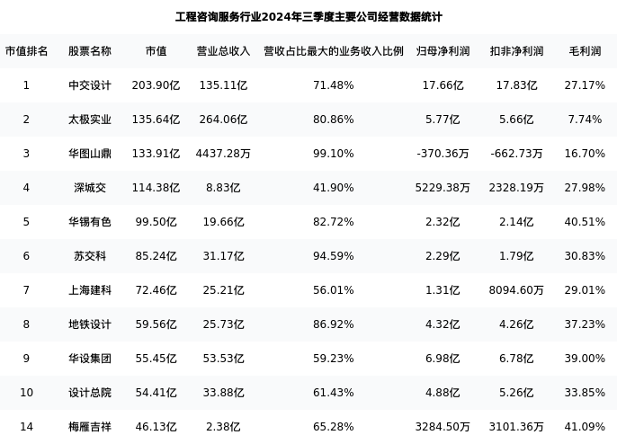 梅雁吉祥最新报告期数据为三季度,下表汇总了工程咨询服务行业内市值靠前的公司三季度主要经营数据