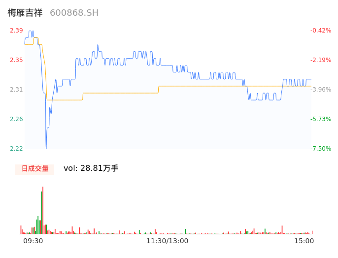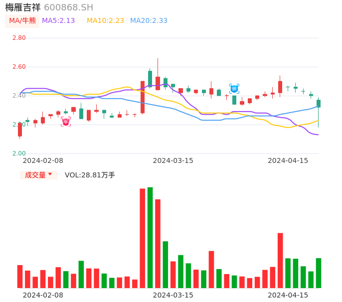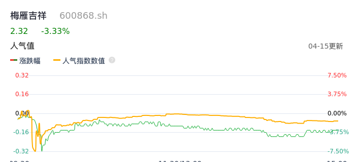 04月15日,梅雁吉祥收报2.32,股价涨幅-3.33%,成交金额6641.03万元,换手率1.52%。
