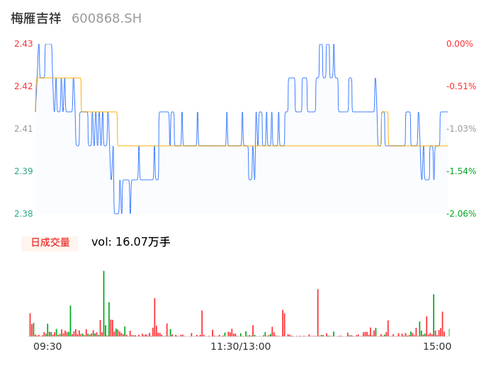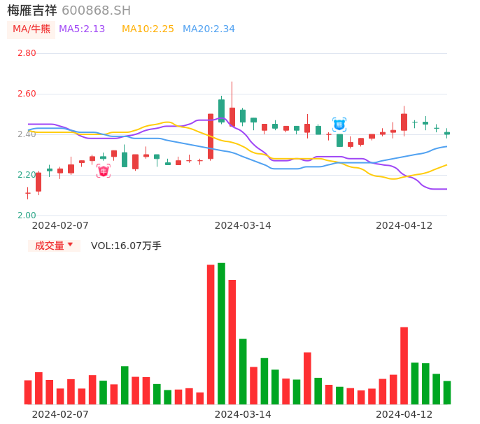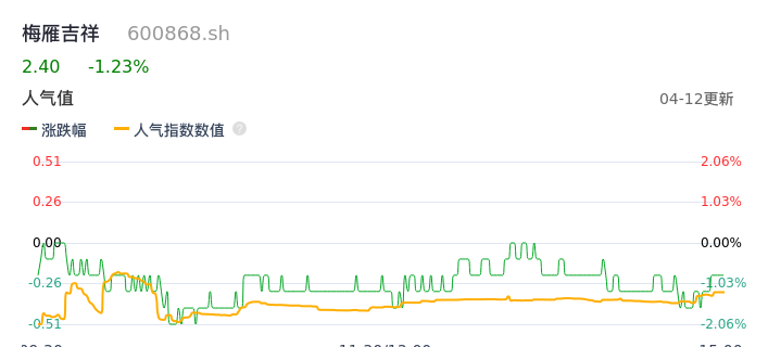 04月12日,梅雁吉祥收报2.40,股价涨幅-1.23%,成交金额3863.58万元,换手率0.85%。