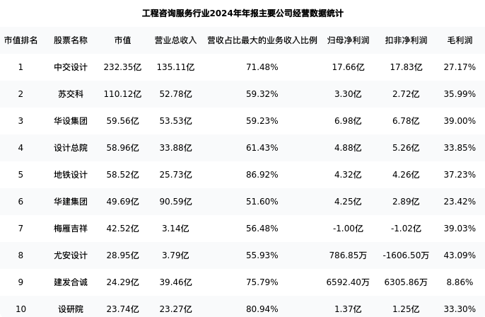 梅雁吉祥最新报告期数据为年报,下表汇总了工程咨询服务行业内市值靠前的公司年报主要经营数据