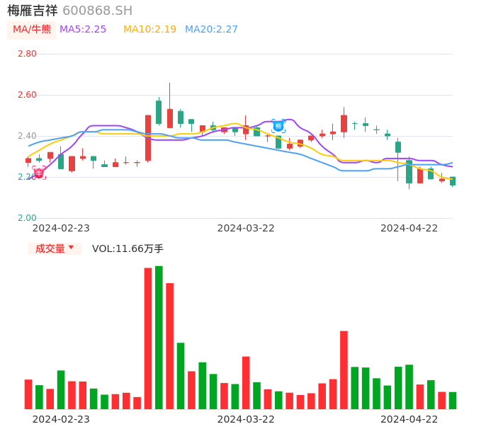 04月22日,梅雁吉祥收报2.16,股价涨幅-1.37%,成交金额2527.63万元,换手率0.61%。