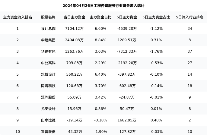 从主力资金流向来看,工程咨询服务行业今日主力资金流入39.61亿元,在所有申万二级行业中排名:96/131。