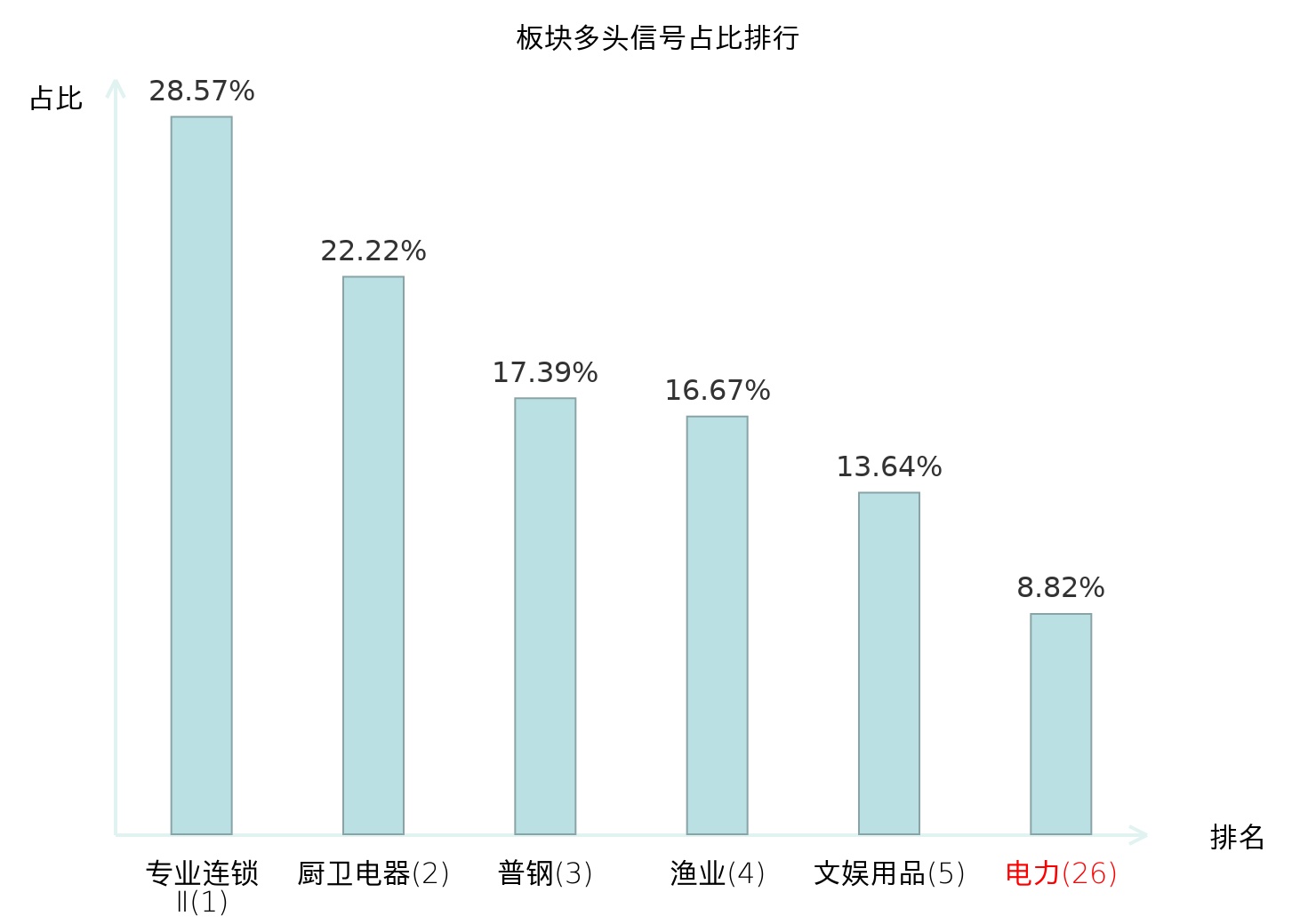 全市场所有行业板块中主力多头信号占比排名中,专业连锁Ⅱ板块位居第一。专业连锁Ⅱ板块名次提升最快,较昨日上升120位。