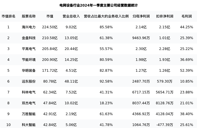 远东股份最新报告期数据为一季度,下表汇总了电网设备行业内市值靠前的公司一季度主要经营数据