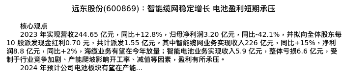 值得注意的是:2024年04月中信建投证券的分析师,首次发布关于远东股份的研究报告,标题为:远东股份(600869):智能缆网稳定增长 电池盈利短期承压。