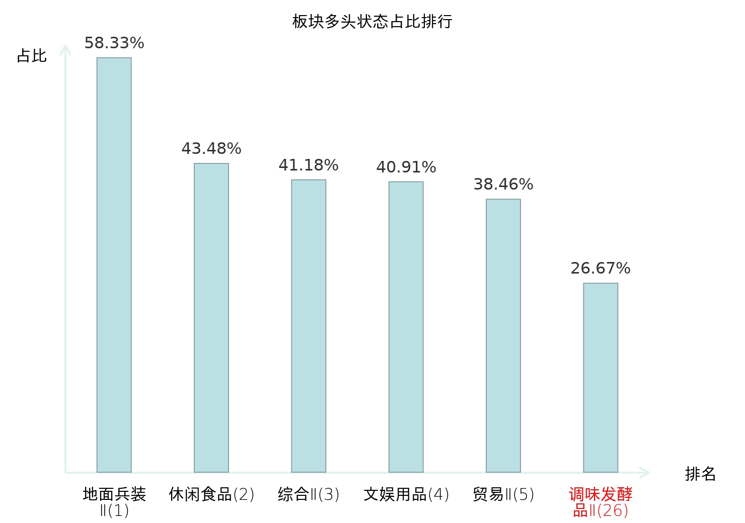 全市场所有行业板块中主力多头状态占比排名中,地面兵装Ⅱ板块位居第一。林业Ⅱ板块名次提升最快,较昨日上升90位。