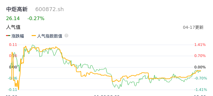 04月17日,中炬高新收报26.14,股价涨幅-0.27%,成交金额2.99亿元,换手率1.45%。