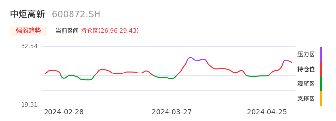 我们来看一下该股的九方特色指标强弱趋势的情况:中炬高新近日从压力区回到持仓区。股价快速拉升后出现持续调整。后续主要关注下方支撑位:26.96元是否能启稳回升。
