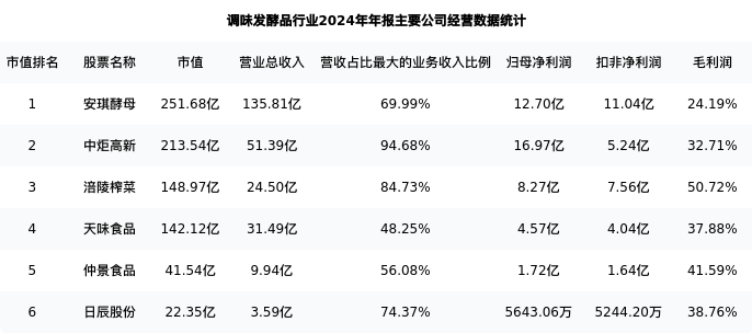 中炬高新最新报告期数据为年报,下表汇总了调味发酵品行业内市值靠前的公司年报主要经营数据