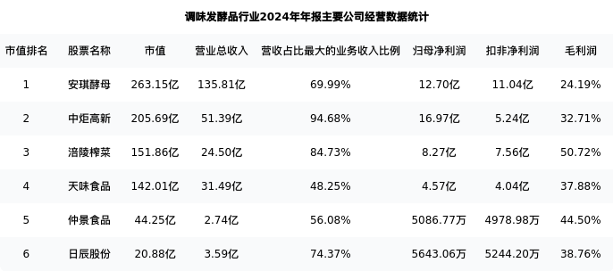 中炬高新最新报告期数据为年报,下表汇总了调味发酵品行业内市值靠前的公司年报主要经营数据
