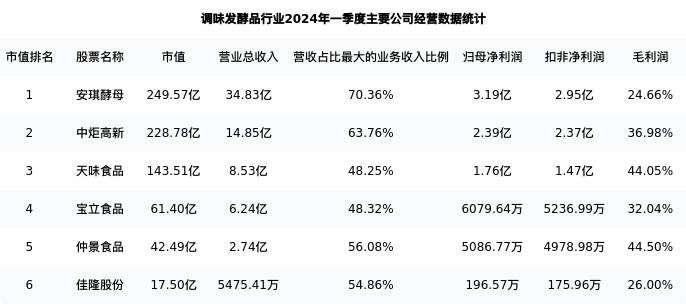 中炬高新最新报告期数据为一季度,下表汇总了调味发酵品行业内市值靠前的公司一季度主要经营数据