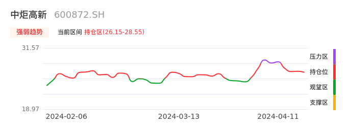 我们来看一下该股的九方特色指标强弱趋势的情况:中炬高新自04月08日从压力区回到持仓区。股价近期持续调整。后续重点关注能否站稳多空分界点:26.15元。如被有效击穿则将进入空头行情。