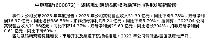 值得注意的是:2024年04月长城证券的刘鹏/罗丽文分析师,首次发布关于中炬高新的研究报告,标题为:中炬高新(600872):战略规划明确&股权激励落地 迎接发展新阶段。