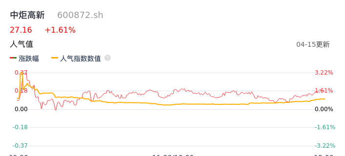 04月15日,中炬高新收报27.16,股价涨幅1.61%,成交金额2.81亿元,换手率1.32%。