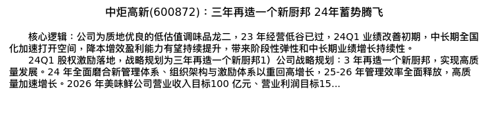 值得注意的是:2024年04月浙商证券的杨骥分析师,首次发布关于中炬高新的研究报告,标题为:中炬高新(600872):三年再造一个新厨邦 24年蓄势腾飞。