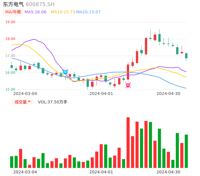 04月30日,东方电气收报16.86,股价涨幅-2.09%,成交金额6.32亿元,换手率1.85%。
