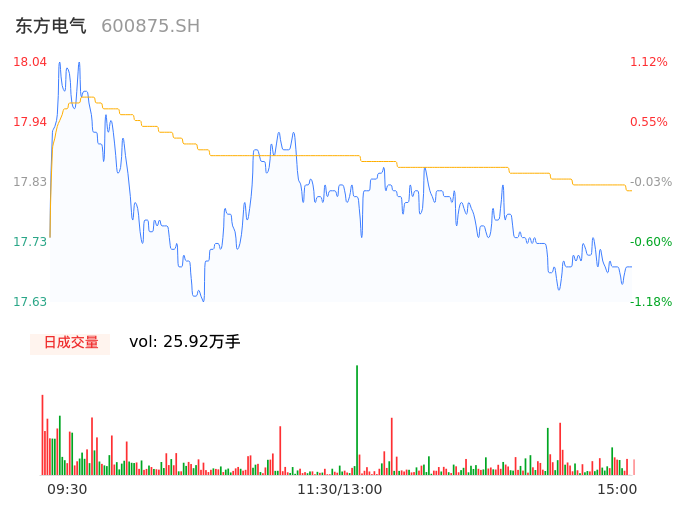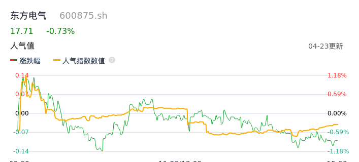 04月23日,东方电气收报17.71,股价涨幅-0.73%,成交金额4.62亿元,换手率1.28%。