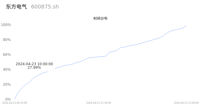 600875东方电气2024年04月23日成交25.92万手,成交金额4.62亿元,相较昨日缩量16.52万手,换手率1.28%,成交清淡。