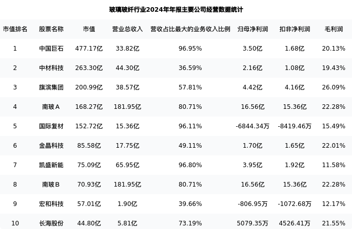 凯盛新能最新报告期数据为年报,下表汇总了玻璃玻纤行业内市值靠前的公司年报主要经营数据